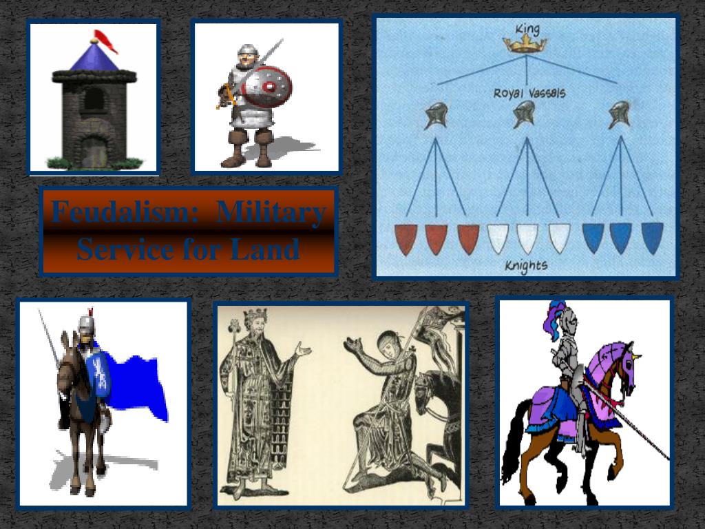 Feudalism • Invaders posed a threat to the safety of the people due to decentralized government • People began to turn landed aristocrats or nobles for protection/ led to feudalism • Feudalism arose between 800-900/ similar system in Japan- Samurai • Vassalage = center of feudalism/ came from Germanic society where warriors swore oath to their leader • Vassal = man who served a lord militarily