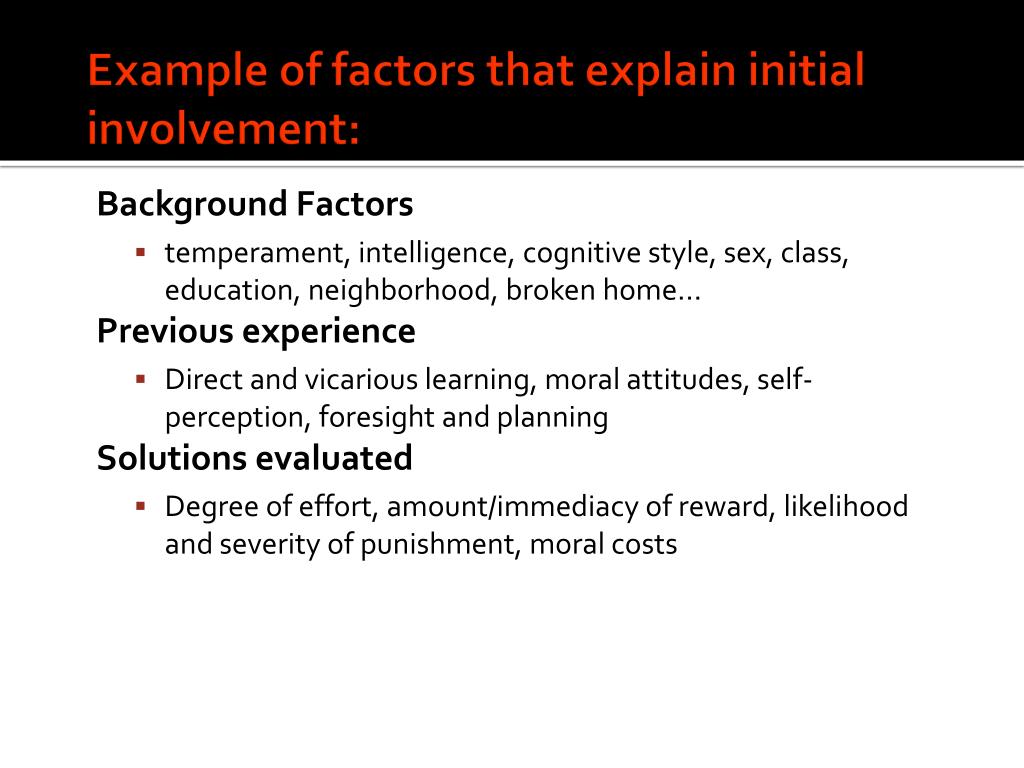 Example of factors that explain initial involvement: Background Factors • temperament, intelligence, cognitive style, sex, class, education, neighborhood, broken home… Previous experience • Direct and vicarious learning, moral attitudes, self-perception, foresight and planning Solutions evaluated • Degree of effort, amount/immediacy of reward, likelihood and severity of punishment, moral costs