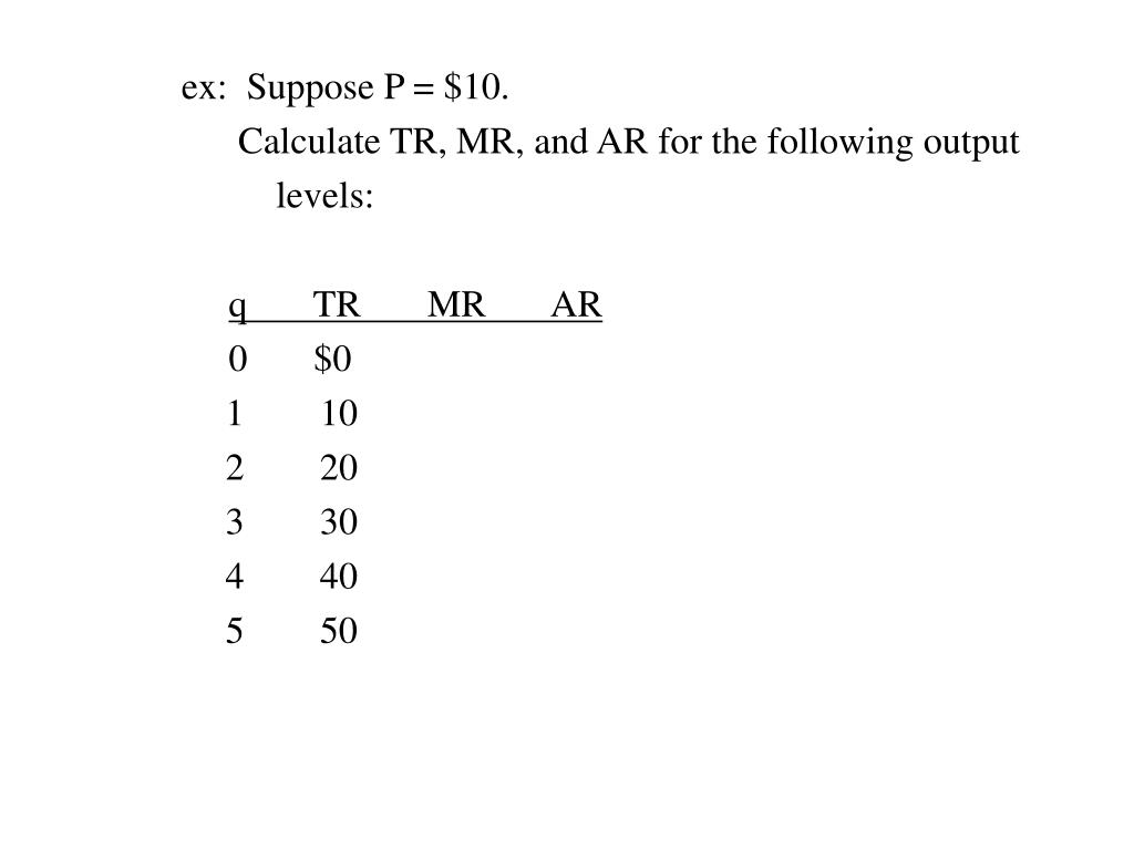 ex: Suppose P = $10. Calculate TR, MR, and AR for the following output levels: q TR MR AR 0 $0 1 10 2 20 3 30 4 40 5 50
