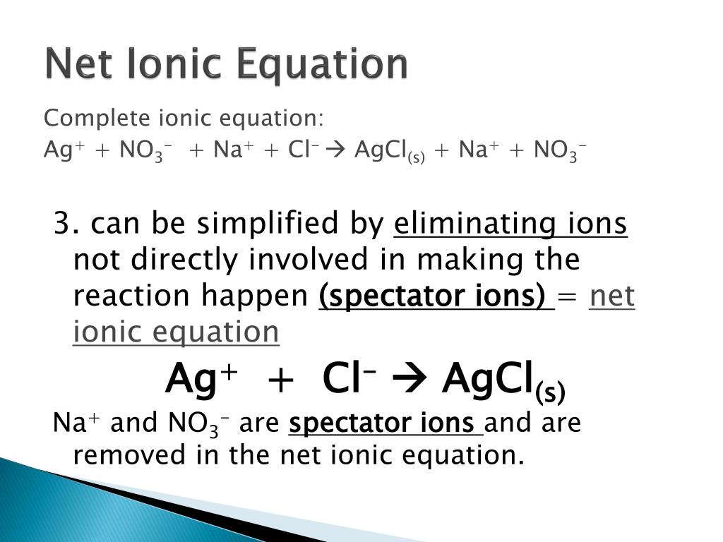 Net Ionic Equation Complete ionic equation: Ag+ + NO3- + Na+ + Cl- AgCl(s) + Na+ + NO3- 3. can be simplified by eliminating ions not directly involved in making the reaction happen (spectator ions) = net ionic equation Ag+ + Cl- AgCl(s) Na+ and NO3- are spectator ions and are removed in the net ionic equation.