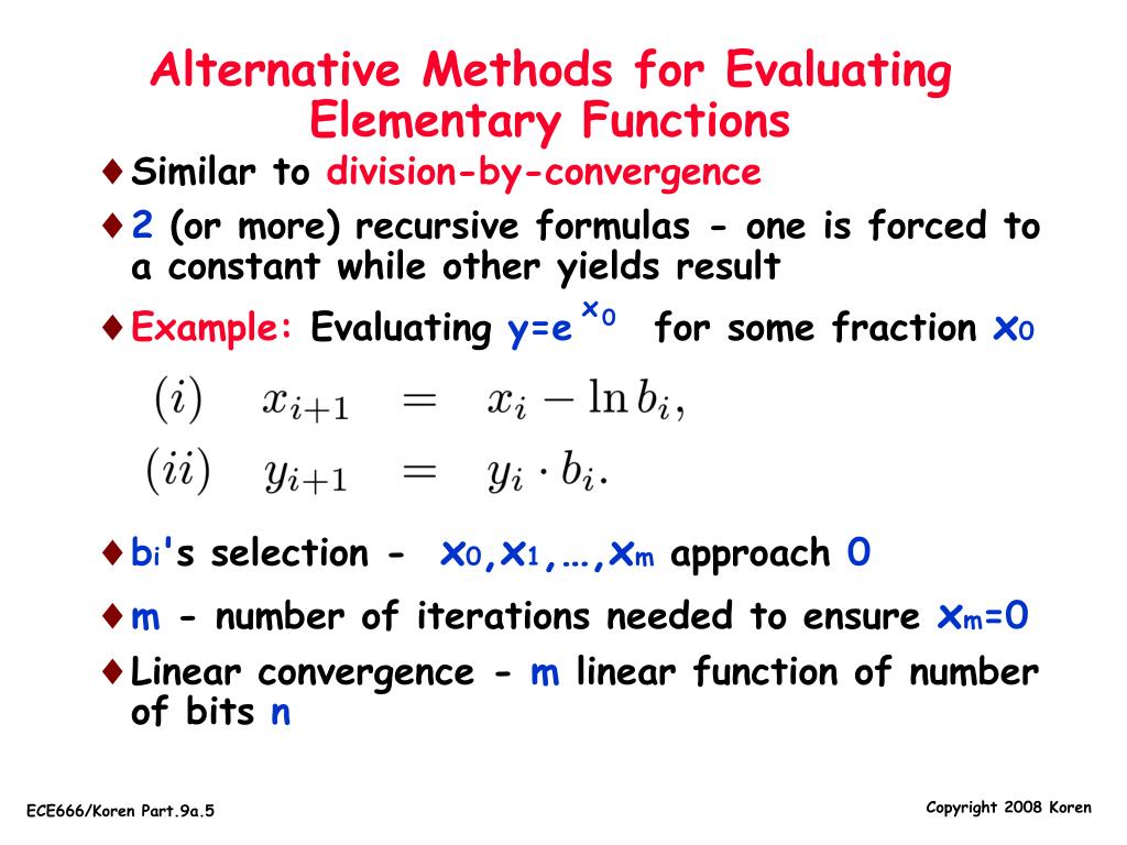 Alternative Methods for Evaluating Elementary Functions • Similar to division-by-convergence • 2 (or more) recursive formulas - one is forced to a constant while other yields result • Example: Evaluating y=e for some fraction x0 • bi's selection - x0,x1,…,xm approach 0 • m - number of iterations needed to ensure xm=0 • Linear convergence - m linear function of number of bits n x 0