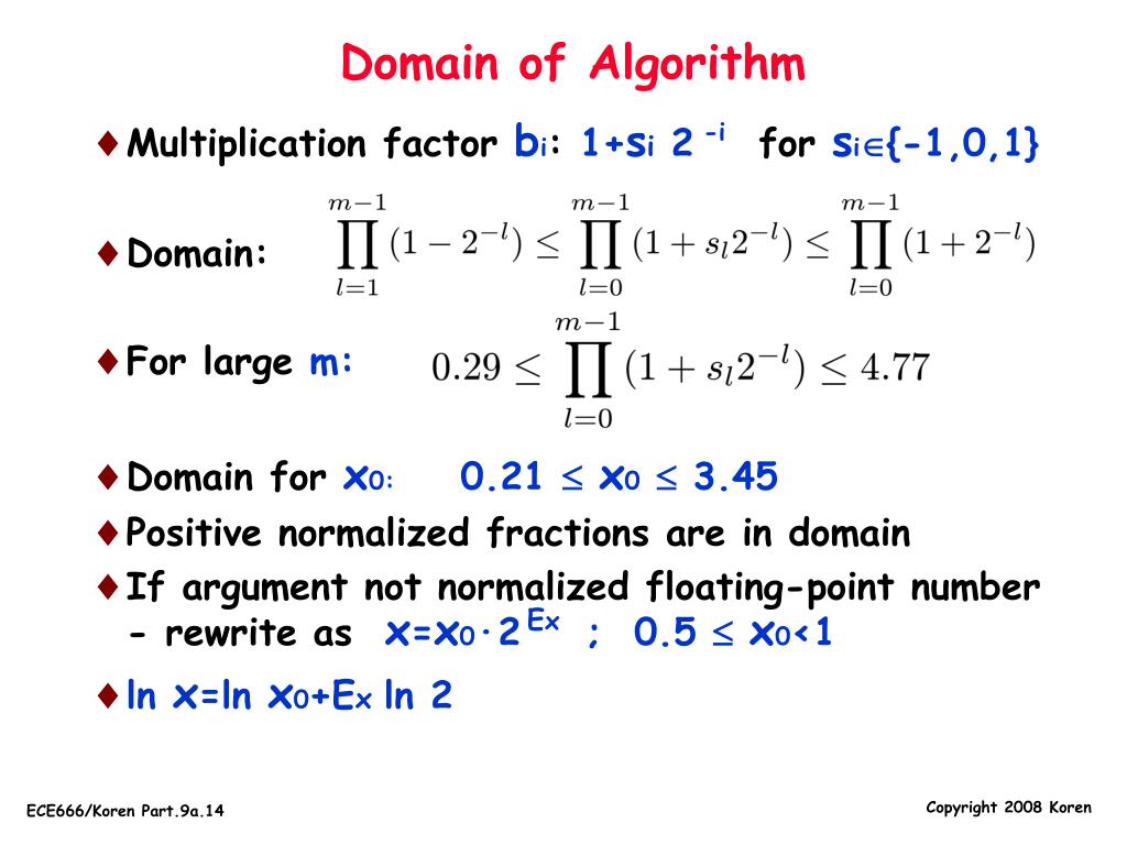 Domain of Algorithm -i • Multiplication factor bi: 1+si 2 forsi{-1,0,1} • Domain: • For large m: • Domain for x0: 0.21 x0 3.45 • Positive normalized fractions are in domain • If argument not normalized floating-point number - rewrite as x=x0·2 ;0.5 x0<1 • ln x=ln x0+Ex ln 2 Ex