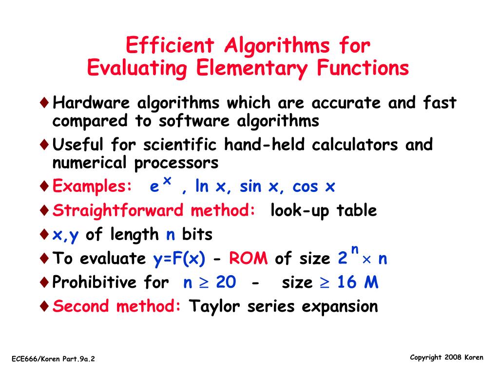 Efficient Algorithms for Evaluating Elementary Functions • Hardware algorithms which are accurate and fast compared to software algorithms • Useful for scientific hand-held calculators and numerical processors • Examples:e , ln x, sin x, cos x • Straightforward method: look-up table • x,y of length n bits • To evaluate y=F(x) - ROM of size 2 n • Prohibitive for n 20 - size 16 M • Second method: Taylor series expansion x n