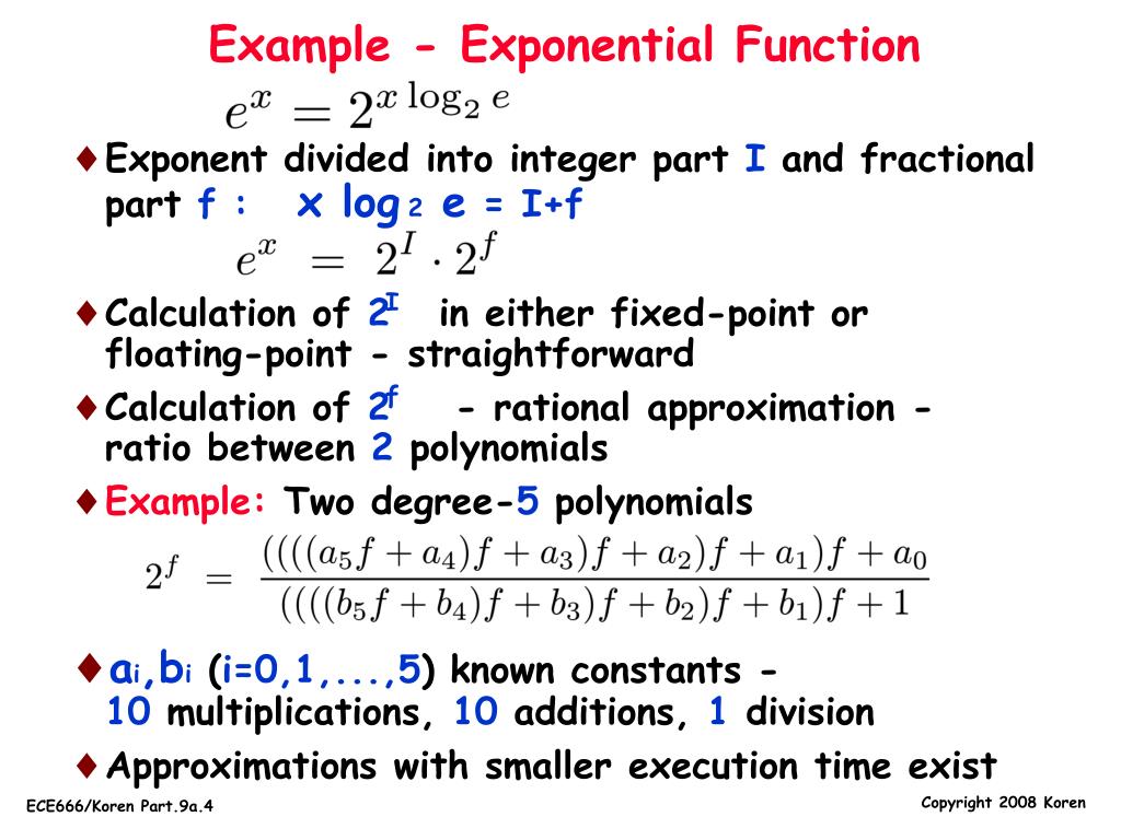 Example - Exponential Function • Exponent divided into integer part I and fractional part f : x log2 e= I+f • Calculation of 2 in either fixed-point or floating-point - straightforward • Calculation of 2 - rational approximation - ratio between 2 polynomials • Example: Two degree-5 polynomials • ai,bi(i=0,1,...,5) known constants - 10 multiplications, 10 additions, 1 division • Approximations with smaller execution time exist I f