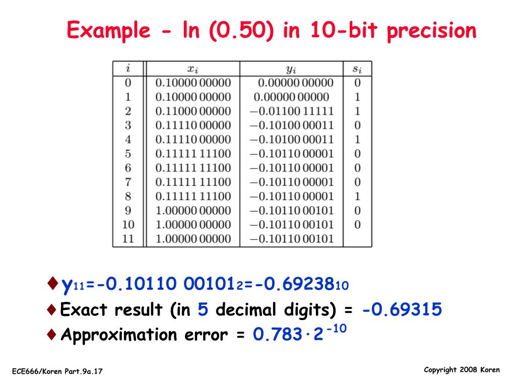 Example - ln (0.50) in 10-bit precision • y11=-0.10110 001012=-0.6923810 • Exact result (in 5 decimal digits) = -0.69315 • Approximation error = 0.783·2 -10