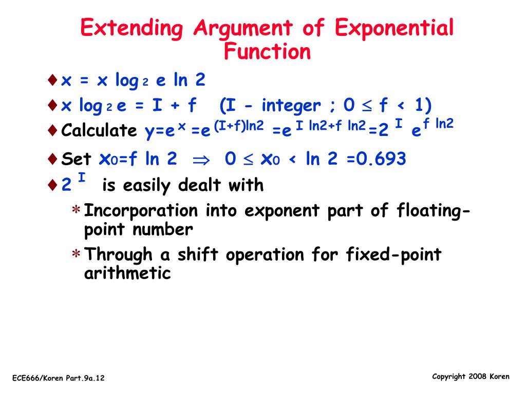 Extending Argument of Exponential Function • x = x log2 e ln 2 • x log2 e = I + f (I - integer ; 0 f < 1) • Calculate y=e =e =e =2 e • Set x0=f ln 2 0 x0 < ln 2 =0.693 • 2 is easily dealt with • Incorporation into exponent part of floating-point number • Through a shift operation for fixed-point arithmetic I f ln2 x (I+f)ln2 I ln2+f ln2 I