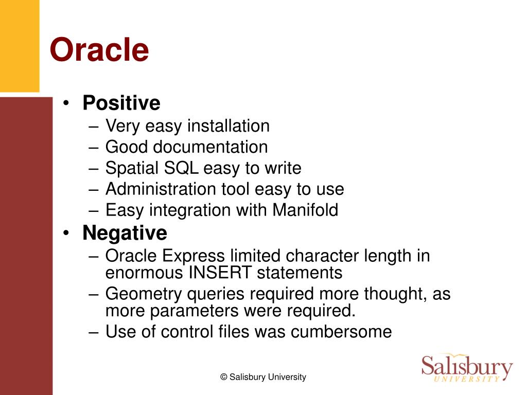 Oracle • Positive • Very easy installation • Good documentation • Spatial SQL easy to write • Administration tool easy to use • Easy integration with Manifold • Negative • Oracle Express limited character length in enormous INSERT statements • Geometry queries required more thought, as more parameters were required. • Use of control files was cumbersome