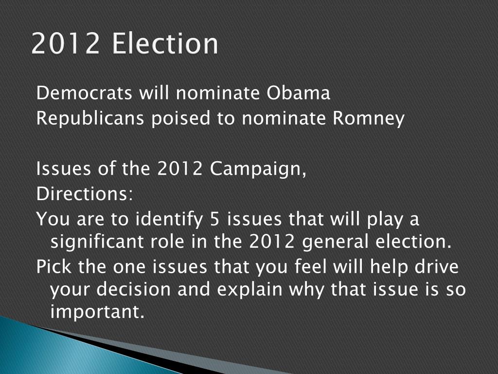 2012 Election Democrats will nominate Obama Republicans poised to nominate Romney Issues of the 2012 Campaign, Directions: You are to identify 5 issues that will play a significant role in the 2012 general election. Pick the one issues that you feel will help drive your decision and explain why that issue is so important.