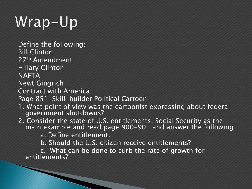 Wrap-Up Define the following: Bill Clinton 27th Amendment Hillary Clinton NAFTA Newt Gingrich Contract with America Page 851: Skill-builder Political Cartoon 1. What point of view was the cartoonist expressing about federal government shutdowns? 2. Consider the state of U.S. entitlements, Social Security as the main example and read page 900-901 and answer the following: a. Define entitlement. b. Should the U.S. citizen receive entitlements? c. What can be done to curb the rate of growth for entitlements?