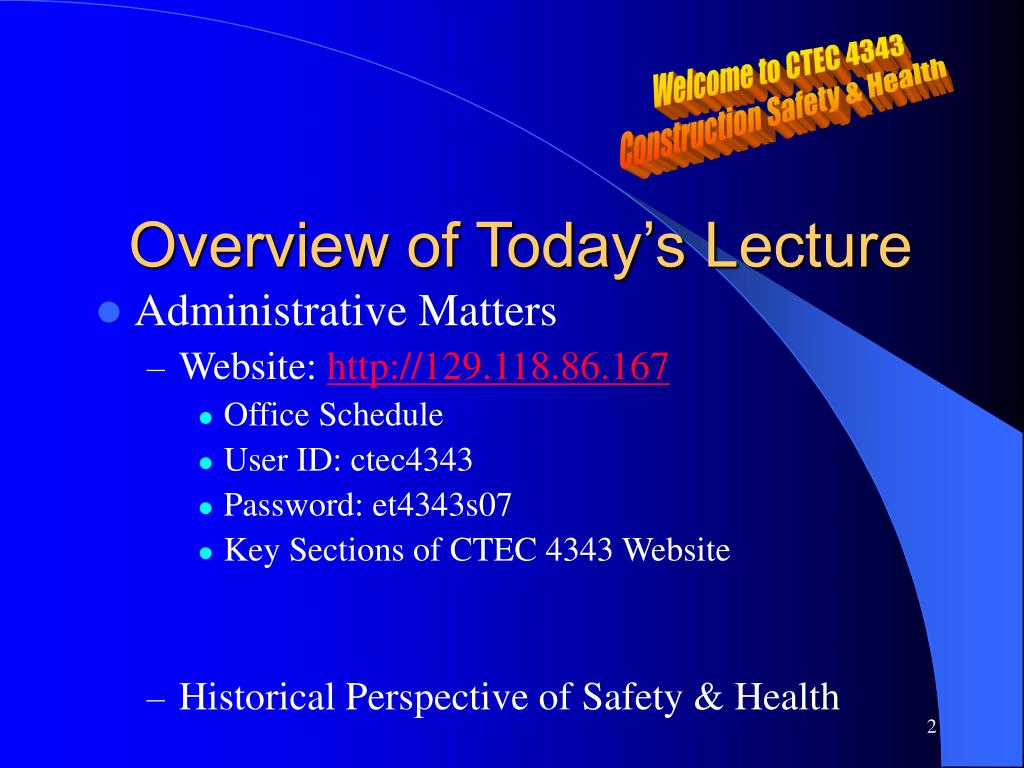 Welcome to CTEC 4343 Construction Safety & Health Overview of Today’s Lecture • Administrative Matters • Website: http://129.118.86.167 • Office Schedule • User ID: ctec4343 • Password: et4343s07 • Key Sections of CTEC 4343 Website • Historical Perspective of Safety & Health