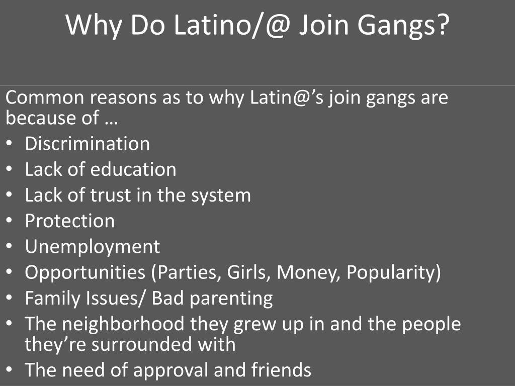 Why Do Latino/@ Join Gangs? Common reasons as to why Latin@’s join gangs are because of … • Discrimination • Lack of education • Lack of trust in the system • Protection • Unemployment • Opportunities (Parties, Girls, Money, Popularity) • Family Issues/ Bad parenting • The neighborhood they grew up in and the people they’re surrounded with • The need of approval and friends