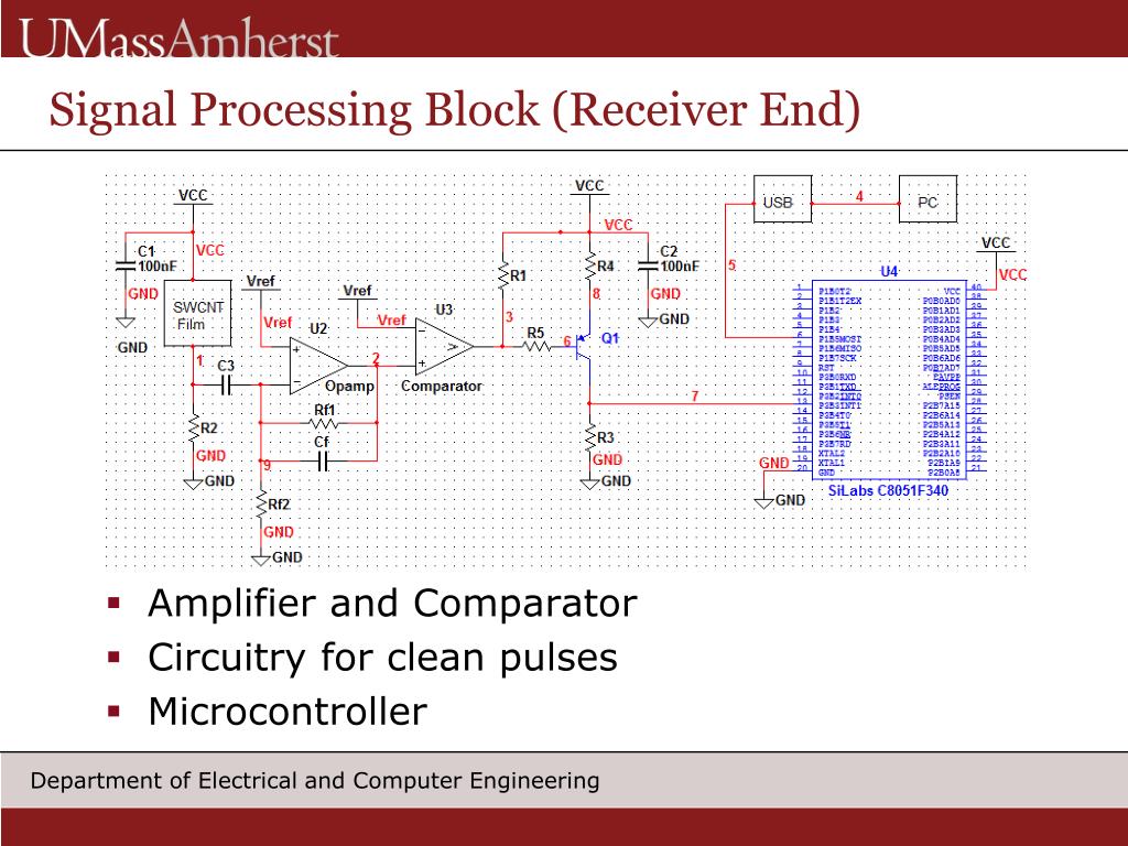 Signal Processing Block (Receiver End) • Amplifier and Comparator • Circuitry for clean pulses • Microcontroller