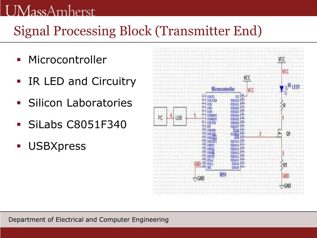 Signal Processing Block (Transmitter End) • Microcontroller • IR LED and Circuitry • Silicon Laboratories • SiLabs C8051F340 • USBXpress