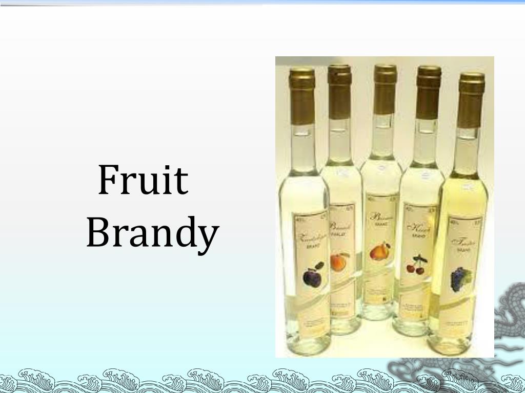 About Brandy • Brandy is a spirit produced by distilling wine. Brandy generally contains 35–60% alcohol by volume (70–120US proof) and is typically taken as an after-dinner drink. Some brandies are aged in wooden casks, some are coloured with caramel colouring to imitate the effect of aging, and some brandies are produced using a combination of both aging and colouring. • Brandy is also produced from fermented fruits other than grapes, but these products are typically named eaux-de-vie, especially in French.