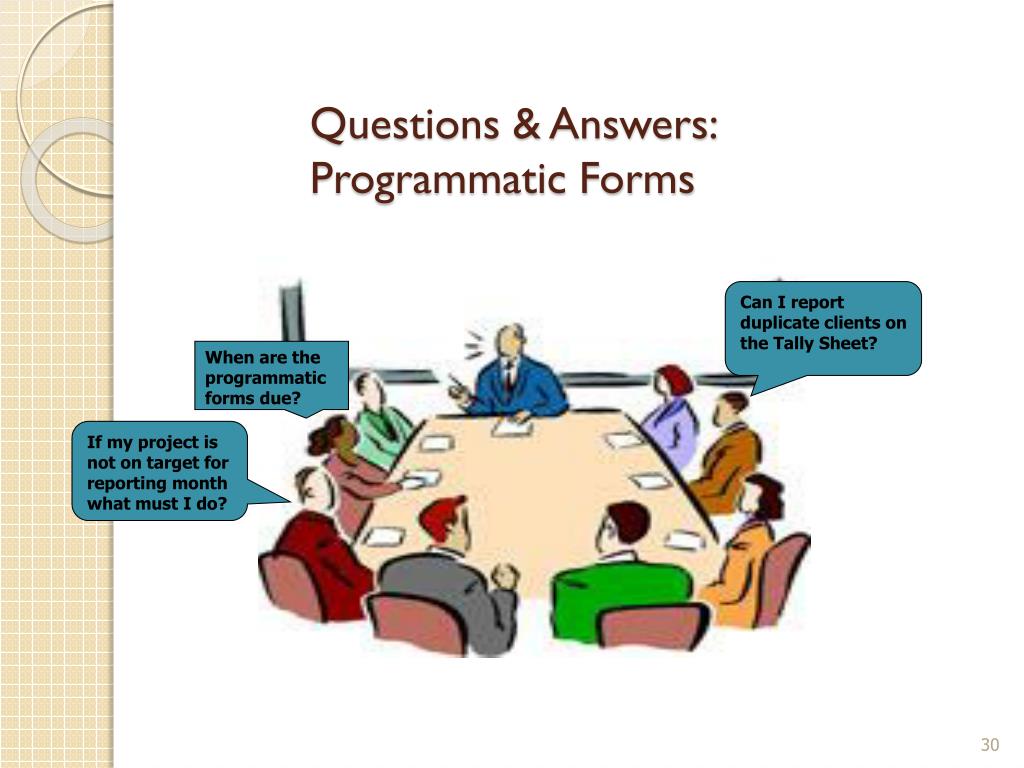 Questions & Answers: Programmatic Forms Can I report duplicate clients on the Tally Sheet? When are the programmatic forms due? If my project is not on target for reporting month what must I do?