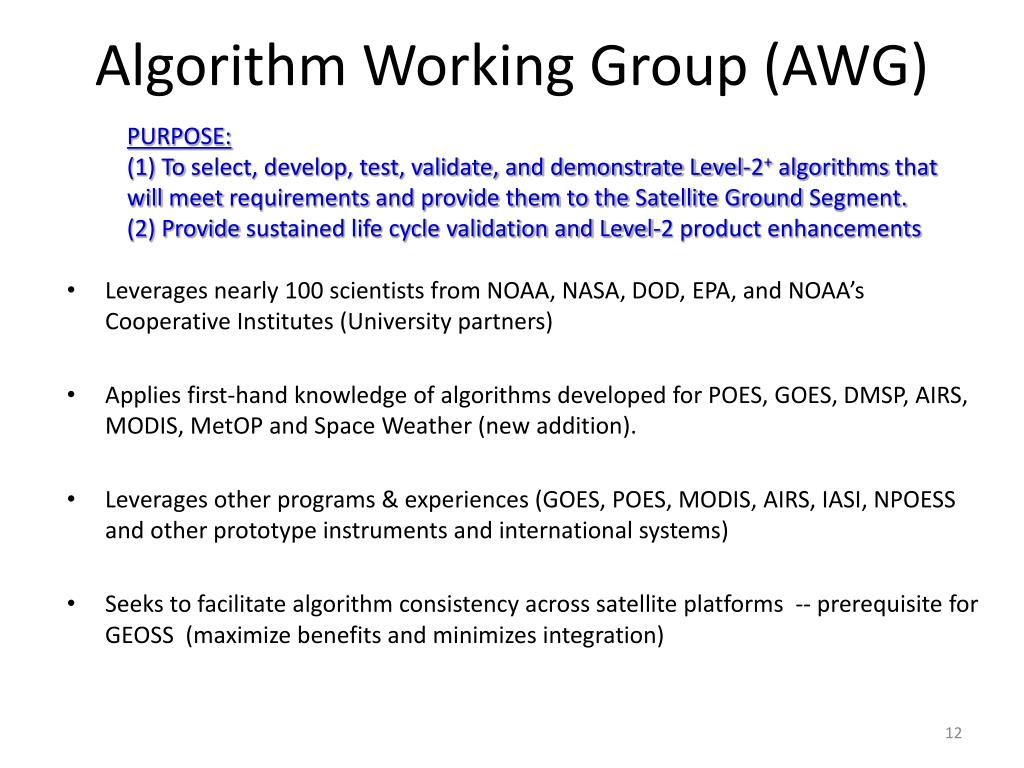 Algorithm Working Group (AWG) • PURPOSE: • (1)To select, develop, test, validate, and demonstrate Level-2+ algorithms that will meet requirements and provide them to the Satellite Ground Segment. • (2) Provide sustained life cycle validation and Level-2 product enhancements • Leverages nearly 100 scientists from NOAA, NASA, DOD, EPA, and NOAA’s Cooperative Institutes (University partners) • Applies first-hand knowledge of algorithms developed for POES, GOES, DMSP, AIRS, MODIS, MetOP and Space Weather (new addition). • Leverages other programs & experiences (GOES, POES, MODIS, AIRS, IASI, NPOESS and other prototype instruments and international systems) • Seeks to facilitate algorithm consistency across satellite platforms -- prerequisite for GEOSS (maximize benefits and minimizes integration)