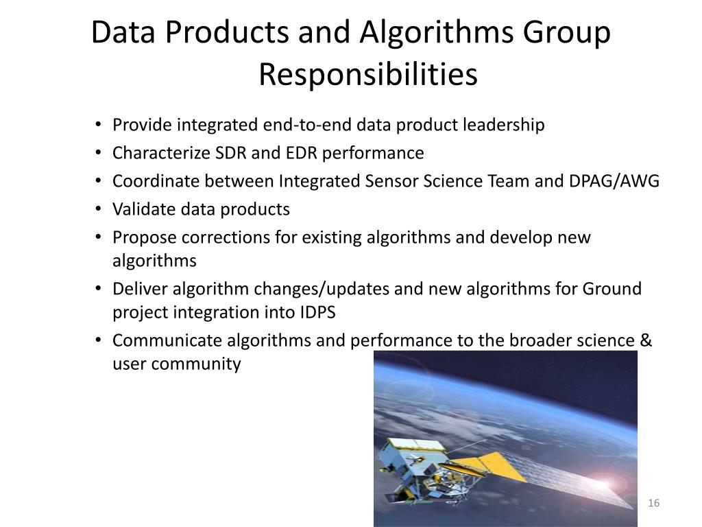 Data Products and Algorithms Group Responsibilities • Provide integrated end-to-end data product leadership • Characterize SDR and EDR performance • Coordinate between Integrated Sensor Science Team and DPAG/AWG • Validate data products • Propose corrections for existing algorithms and develop new algorithms • Deliver algorithm changes/updates and new algorithms for Ground project integration into IDPS • Communicate algorithms and performance to the broader science & user community