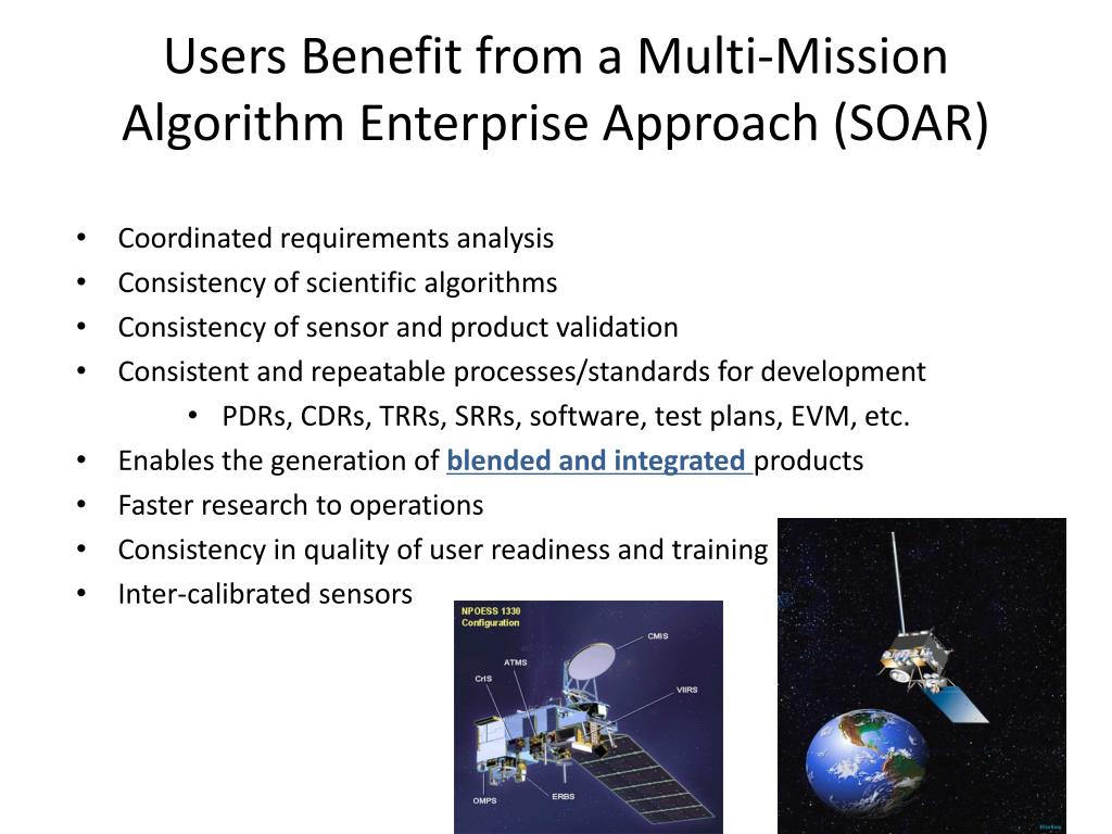 Users Benefit from a Multi-Mission Algorithm Enterprise Approach (SOAR) Coordinated requirements analysis Consistency of scientific algorithms Consistency of sensor and product validation Consistent and repeatable processes/standards for development PDRs, CDRs, TRRs, SRRs, software, test plans, EVM, etc. Enables the generation of blended and integrated products Faster research to operations Consistency in quality of user readiness and training Inter-calibrated sensors