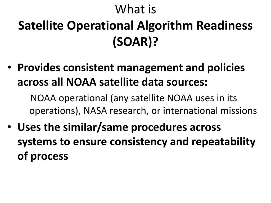 What is Satellite Operational Algorithm Readiness (SOAR)? • Provides consistent management and policies across all NOAA satellite data sources: NOAA operational (any satellite NOAA uses in its operations), NASA research, or international missions • Uses the similar/same procedures across systems to ensure consistency and repeatability of process