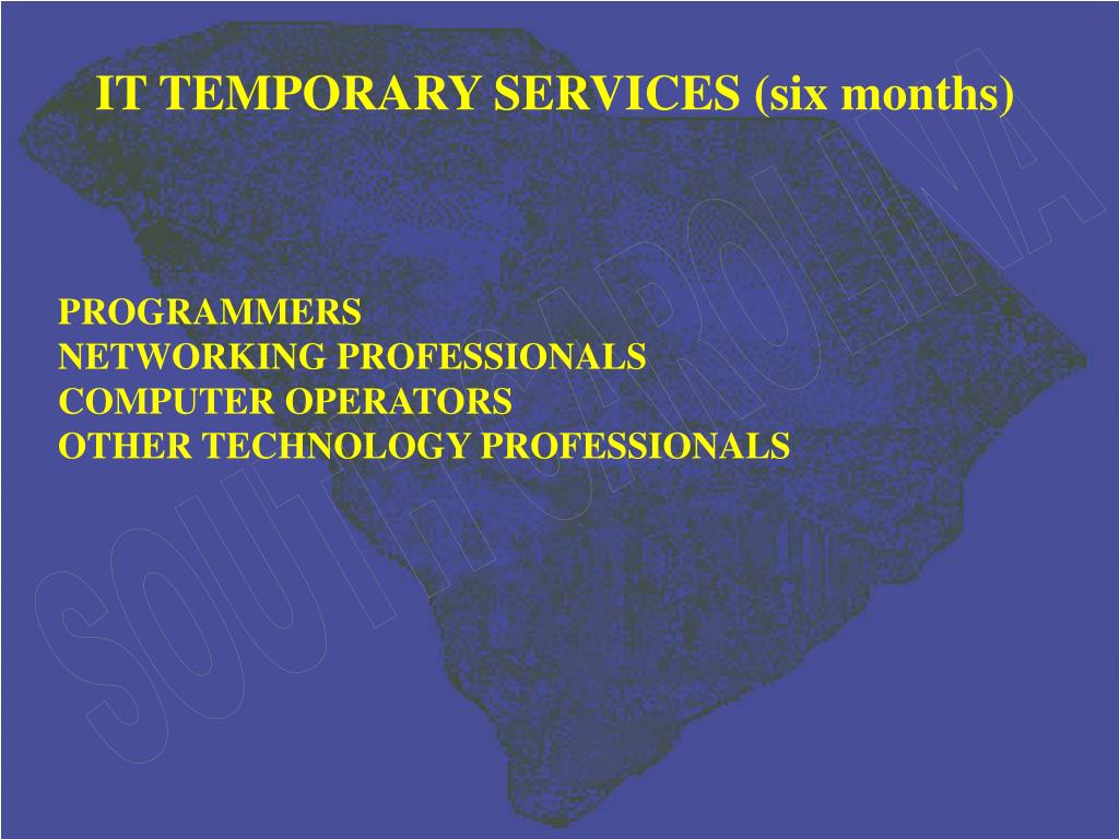 IT TEMPORARY SERVICES (six months) PROGRAMMERSNETWORKING PROFESSIONALSCOMPUTER OPERATORSOTHER TECHNOLOGY PROFESSIONALS