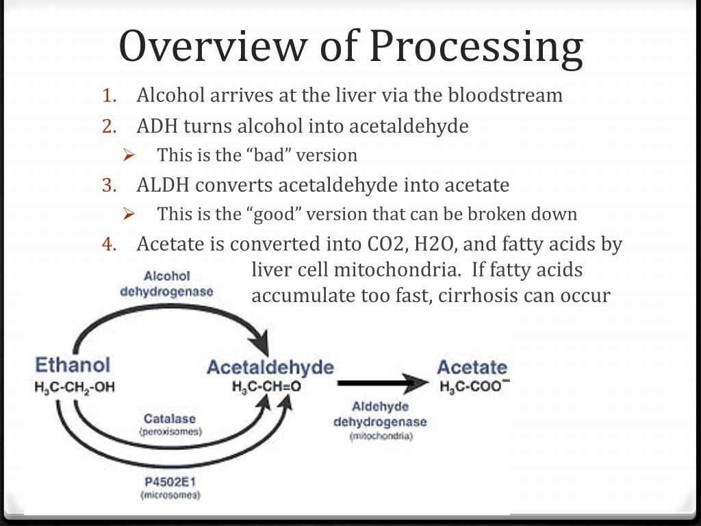 Overview of Processing • Alcohol arrives at the liver via the bloodstream • ADH turns alcohol into acetaldehyde • This is the “bad” version • ALDH converts acetaldehyde into acetate • This is the “good” version that can be broken down • Acetate is converted into CO2, H2O, and fatty acids by liver cell mitochondria. If fatty acids accumulate too fast, cirrhosis can occur