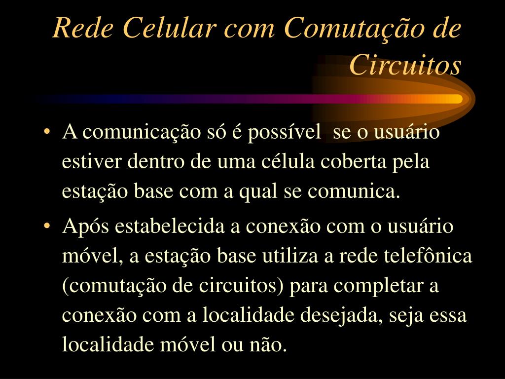 Rede Celular com Comutação de Circuitos • A comunicação só é possível se o usuário estiver dentro de uma célula coberta pela estação base com a qual se comunica. • Após estabelecida a conexão com o usuário móvel, a estação base utiliza a rede telefônica (comutação de circuitos) para completar a conexão com a localidade desejada, seja essa localidade móvel ou não.