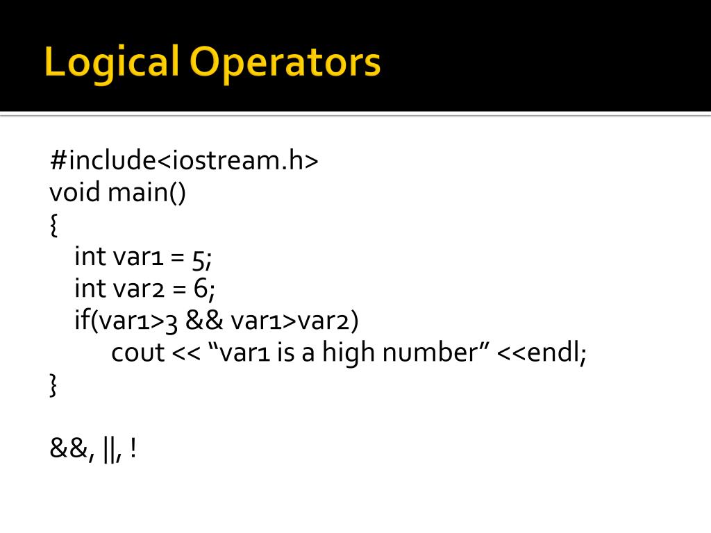 Logical Operators #include<iostream.h> void main() { int var1 = 5; int var2 = 6; if(var1>3 && var1>var2) cout << “var1 is a high number” <<endl; } &&, ||, !