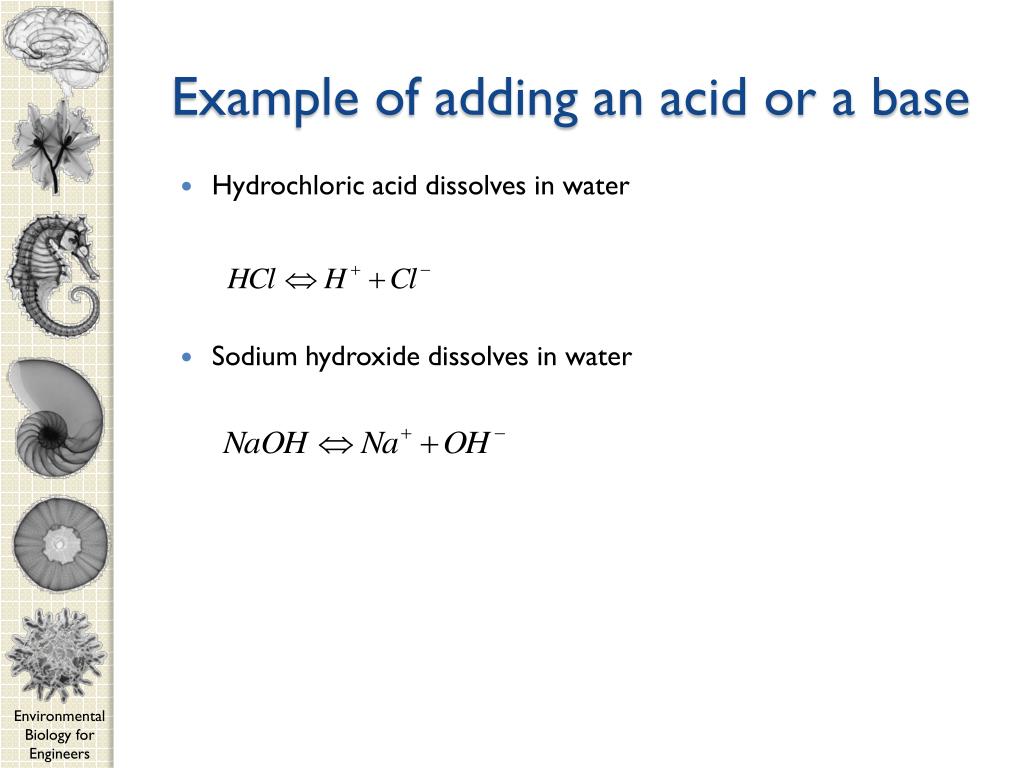 Example of adding an acid or a base • Hydrochloric acid dissolves in water • Sodium hydroxide dissolves in water