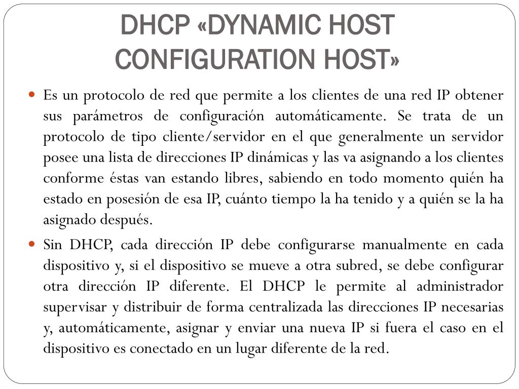 DHCP «DYNAMIC HOST CONFIGURATION HOST» • Es un protocolo de red que permite a los clientes de una red IP obtener sus parámetros de configuración automáticamente. Se trata de un protocolo de tipo cliente/servidor en el que generalmente un servidor posee una lista de direcciones IP dinámicas y las va asignando a los clientes conforme éstas van estando libres, sabiendo en todo momento quién ha estado en posesión de esa IP, cuánto tiempo la ha tenido y a quién se la ha asignado después. • Sin DHCP, cada dirección IP debe configurarse manualmente en cada dispositivo y, si el dispositivo se mueve a otra subred, se debe configurar otra dirección IP diferente. El DHCP le permite al administrador supervisar y distribuir de forma centralizada las direcciones IP necesarias y, automáticamente, asignar y enviar una nueva IP si fuera el caso en el dispositivo es conectado en un lugar diferente de la red.