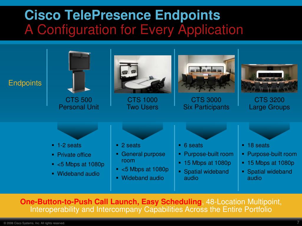 One-Button-to-Push Call Launch, Easy Scheduling, 48-Location Multipoint, Interoperability and Intercompany Capabilities Across the Entire Portfolio Cisco TelePresence EndpointsA Configuration for Every Application Endpoints CTS 500 Personal Unit CTS 1000 Two Users CTS 3000 Six Participants CTS 3200 Large Groups • 1-2 seats • Private office • <5 Mbps at 1080p • Wideband audio • 2 seats • General purpose room • <5 Mbps at 1080p • Wideband audio • 6 seats • Purpose-built room • 15 Mbps at 1080p • Spatial wideband audio • 18 seats • Purpose-built room • 15 Mbps at 1080p • Spatial wideband audio