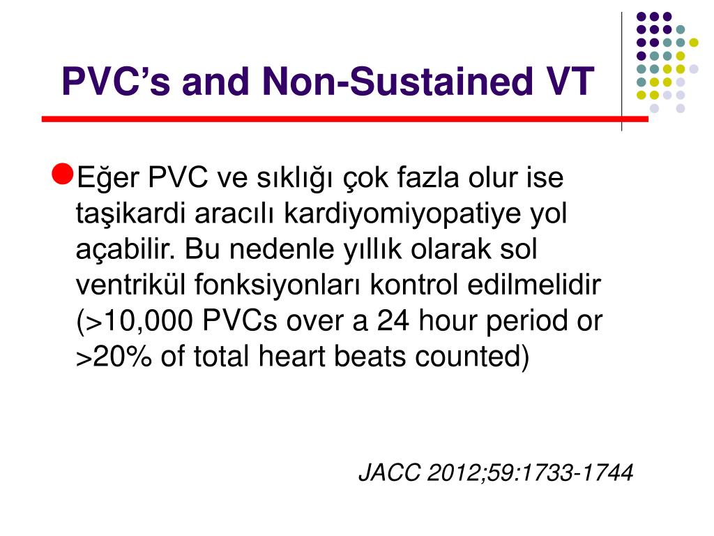 PVC’s and Non-Sustained VT • Eğer PVC ve sıklığı çok fazla olur ise taşikardi aracılı kardiyomiyopatiye yol açabilir. Bu nedenle yıllık olarak sol ventrikül fonksiyonları kontrol edilmelidir (>10,000 PVCs over a 24 hour period or >20% of total heart beats counted) JACC 2012;59:1733-1744