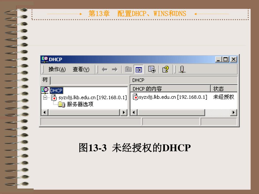 2.授权给DHCP服务器 • 要执行授权的工作时,依次选择“开始”→“程序”→“管理工具”→“DHCP”选项,将出现如图13-3所示的画面。用鼠标右键单击要授权的DHCP服务器,并从弹出的快捷菜单中选择“授权”命令即可,结果如图13-4所示。