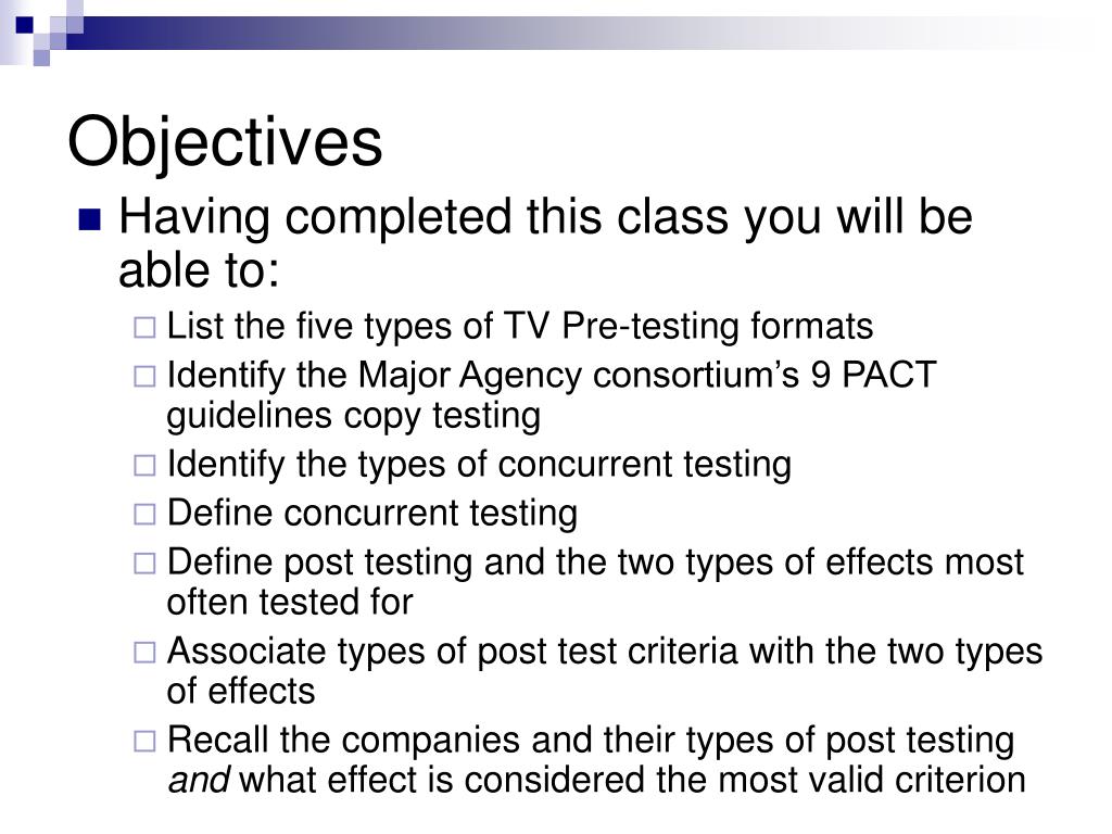 Objectives • Having completed this class you will be able to: • List the five types of TV Pre-testing formats • Identify the Major Agency consortium’s 9 PACT guidelines copy testing • Identify the types of concurrent testing • Define concurrent testing • Define post testing and the two types of effects most often tested for • Associate types of post test criteria with the two types of effects • Recall the companies and their types of post testing and what effect is considered the most valid criterion