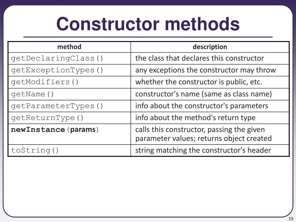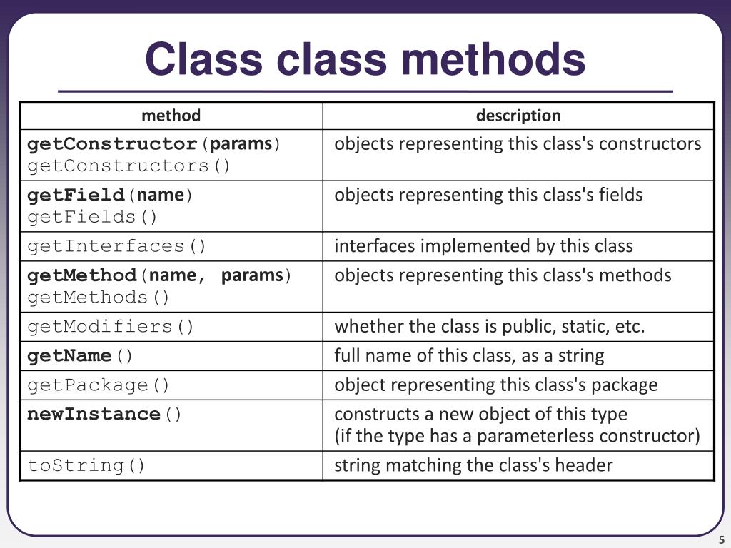 Reflection example • Print all the methods and fields in the Point class: for (Method method : Point.class.getMethods()) { System.out.println("a method: " + method); } for (Field field : Point.class.getFields()) { System.out.println("a field: " + field); }