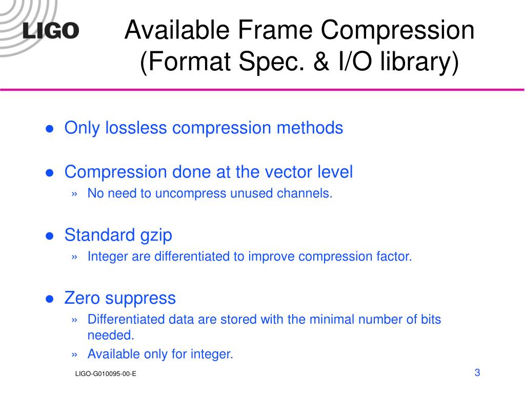 Only lossless compression methods Compression done at the vector level No need to uncompress unused channels. Standard gzip Integer are differentiated to improve compression factor. Zero suppress Differentiated data are stored with the minimal number of bits needed. Available only for integer. Available Frame Compression(Format Spec. & I/O library)