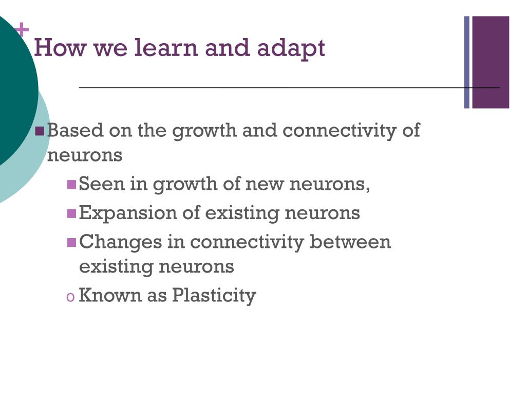 How we learn and adapt • Based on the growth and connectivity of neurons • Seen in growth of new neurons, • Expansion of existing neurons • Changes in connectivity between existing neurons • Known as Plasticity