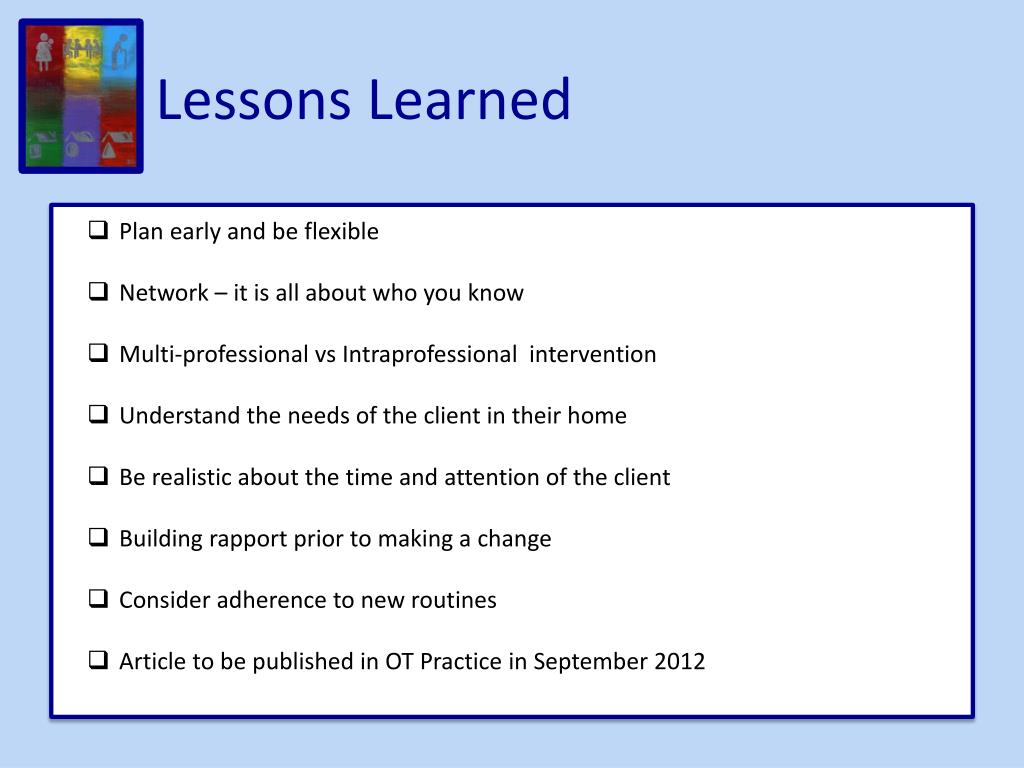 Lessons Learned • Plan early and be flexible • Network – it is all about who you know • Multi-professional vsIntraprofessional intervention • Understand the needs of the client in their home • Be realistic about the time and attention of the client • Building rapport prior to making a change • Consider adherence to new routines • Article to be published in OT Practice in September 2012