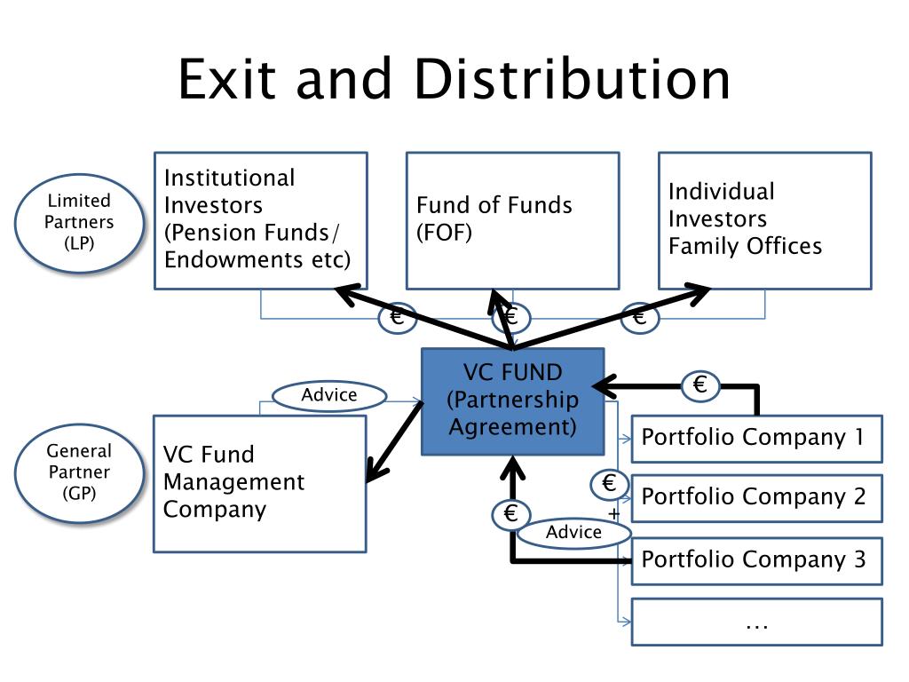 Exit and Distribution Institutional Investors (Pension Funds/ Endowments etc) Fund of Funds (FOF) Individual Investors Family Offices Limited Partners (LP) € € € VC FUND (Partnership Agreement) € Advice VC Fund Management Company Portfolio Company 1 General Partner (GP) € Portfolio Company 2 + € Advice Portfolio Company 3 …