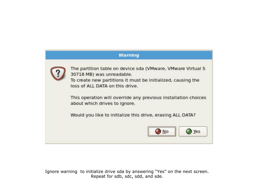 Ignore warning to initialize drive sda by answering “Yes” on the next screen. Repeat for sdb, sdc, sdd, and sde.