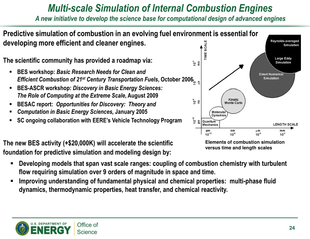 Multi-scale Simulation of Internal Combustion EnginesA new initiative to develop the science base for computational design of advanced engines • Predictive simulation of combustion in an evolving fuel environment is essential for developing more efficient and cleaner engines. • The scientific community has provided a roadmap via: • BES workshop: Basic Research Needs for Clean and Efficient Combustion of 21st Century Transportation Fuels, October 2006 • BES-ASCR workshop: Discovery in Basic Energy Sciences:The Role of Computing at the Extreme Scale, August 2009 • BESAC report: Opportunities for Discovery: Theory and • Computation in Basic Energy Sciences, January 2005 • SC ongoing collaboration with EERE’s Vehicle Technology Program • The new BES activity (+$20,000K) will accelerate the scientific • foundation for predictive simulation and modeling design by: • Developing models that span vast scale ranges: coupling of combustion chemistry with turbulent flow requiring simulation over 9 orders of magnitude in space and time. • Improving understanding of fundamental physical and chemical properties: multi-phase fluid dynamics, thermodynamic properties, heat transfer, and chemical reactivity. Elements of combustion simulation versus time and length scales