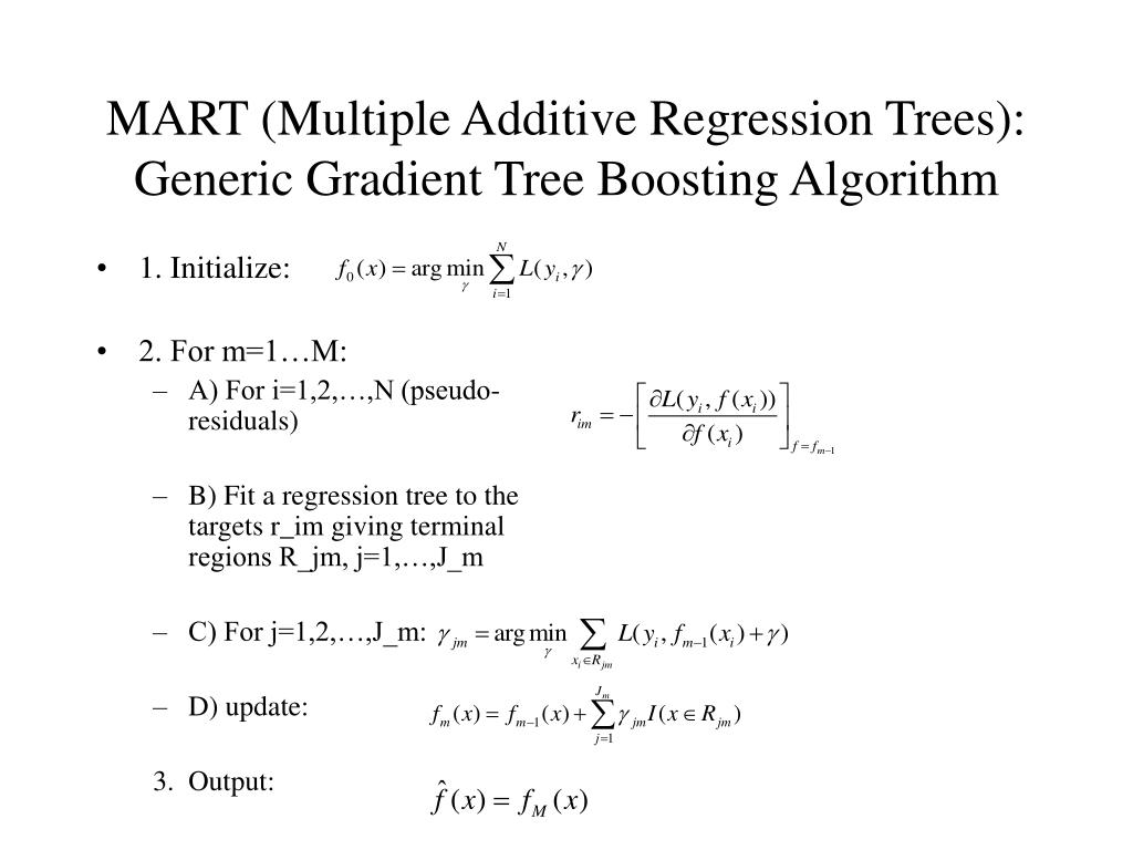 MART (Multiple Additive Regression Trees): Generic Gradient Tree Boosting Algorithm • 1. Initialize: • 2. For m=1…M: • A) For i=1,2,…,N (pseudo-residuals) • B) Fit a regression tree to the targets r_im giving terminal regions R_jm, j=1,…,J_m • C) For j=1,2,…,J_m: • D) update: 3. Output: