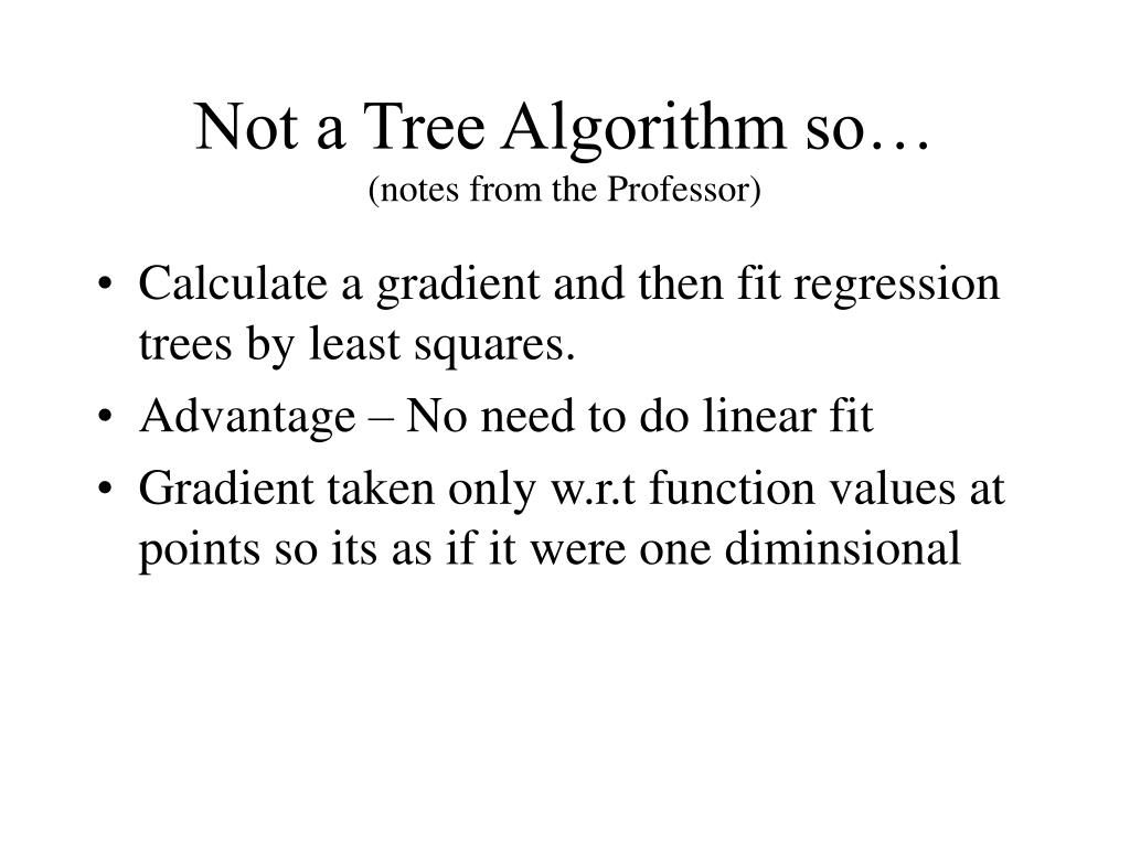 Not a Tree Algorithm so…(notes from the Professor) • Calculate a gradient and then fit regression trees by least squares. • Advantage – No need to do linear fit • Gradient taken only w.r.t function values at points so its as if it were one diminsional