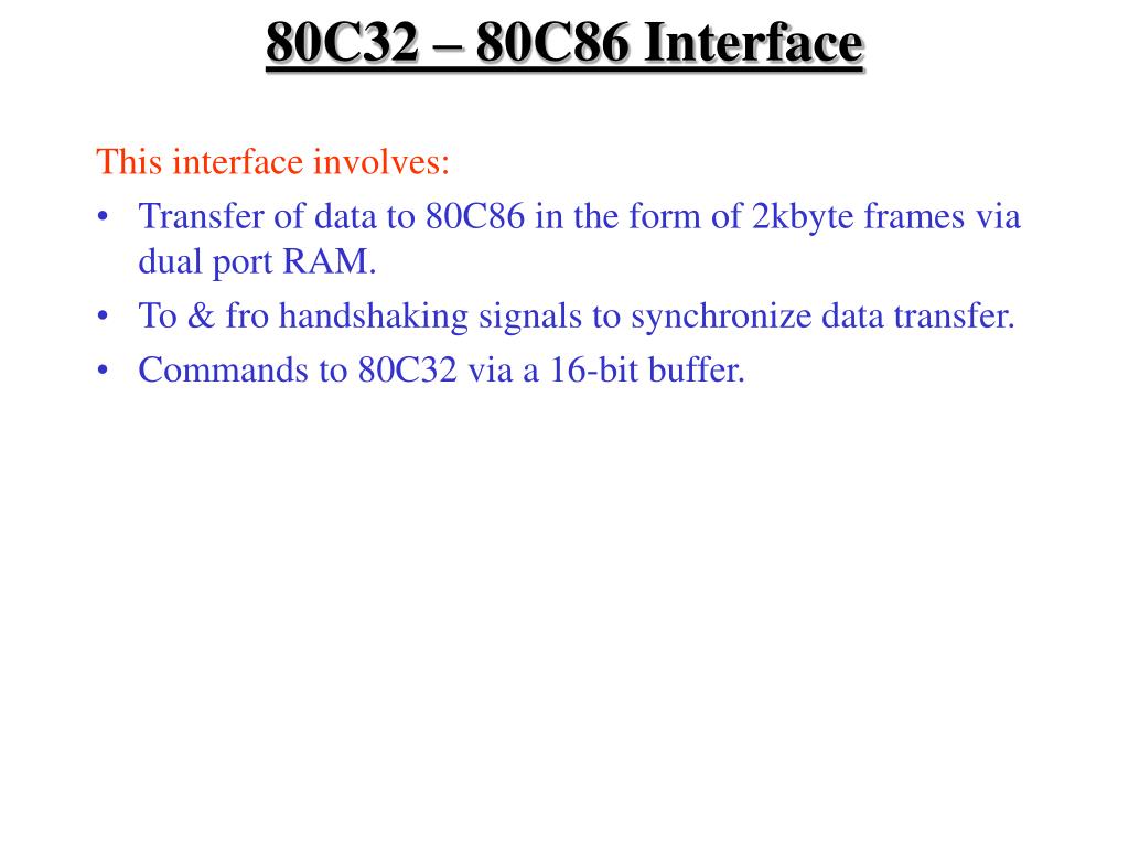 80C32 – 80C86 Interface This interface involves: • Transfer of data to 80C86 in the form of 2kbyte frames via dual port RAM. • To & fro handshaking signals to synchronize data transfer. • Commands to 80C32 via a 16-bit buffer.