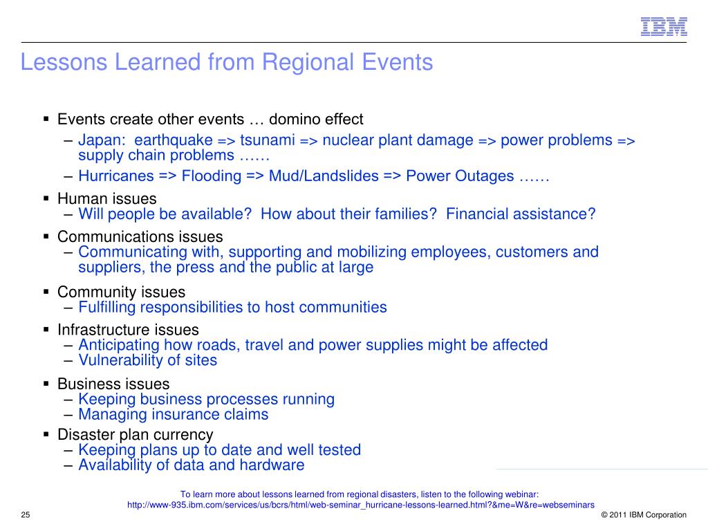 Lessons Learned from Regional Events Events create other events … domino effect Japan: earthquake => tsunami => nuclear plant damage => power problems => supply chain problems …… Hurricanes => Flooding => Mud/Landslides => Power Outages …… • Human issues • Will people be available? How about their families? Financial assistance? • Communications issues • Communicating with, supporting and mobilizing employees, customers and suppliers, the press and the public at large • Community issues • Fulfilling responsibilities to host communities • Infrastructure issues • Anticipating how roads, travel and power supplies might be affected • Vulnerability of sites • Business issues • Keeping business processes running • Managing insurance claims • Disaster plan currency • Keeping plans up to date and well tested • Availability of data and hardware To learn more about lessons learned from regional disasters, listen to the following webinar: http://www-935.ibm.com/services/us/bcrs/html/web-seminar_hurricane-lessons-learned.html?&me=W&re=webseminars 25