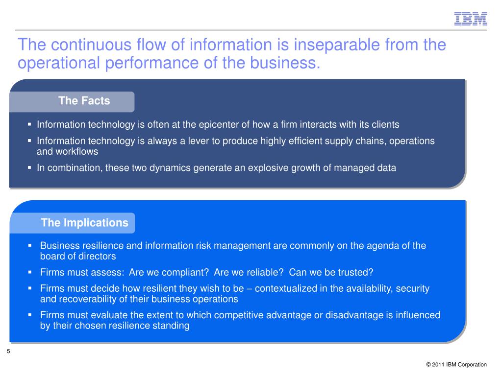 The continuous flow of information is inseparable from the operational performance of the business. Information technology is often at the epicenter of how a firm interacts with its clients Information technology is always a lever to produce highly efficient supply chains, operations and workflows In combination, these two dynamics generate an explosive growth of managed data The Facts The Implications • Business resilience and information risk management are commonly on the agenda of the board of directors • Firms must assess: Are we compliant? Are we reliable? Can we be trusted? • Firms must decide how resilient they wish to be – contextualized in the availability, security and recoverability of their business operations • Firms must evaluate the extent to which competitive advantage or disadvantage is influenced by their chosen resilience standing