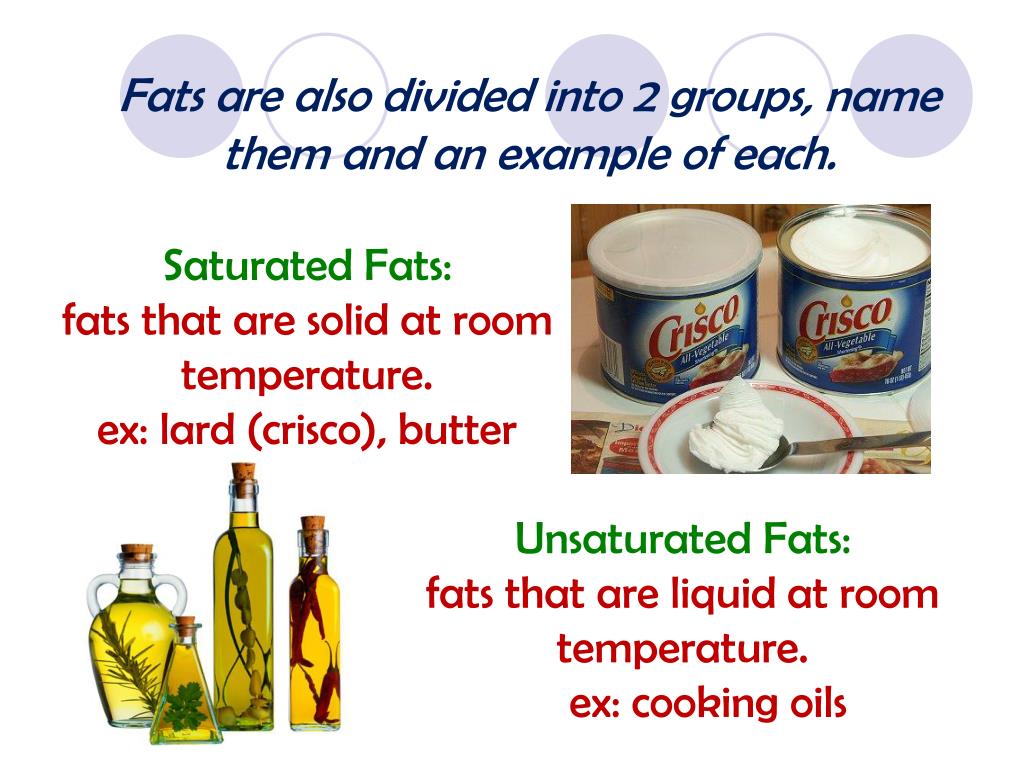 Fats are also divided into 2 groups, name them and an example of each. Saturated Fats: fats that are solid at room temperature. ex: lard (crisco), butter • Unsaturated Fats: • fats that are liquid at room temperature. • ex: cooking oils