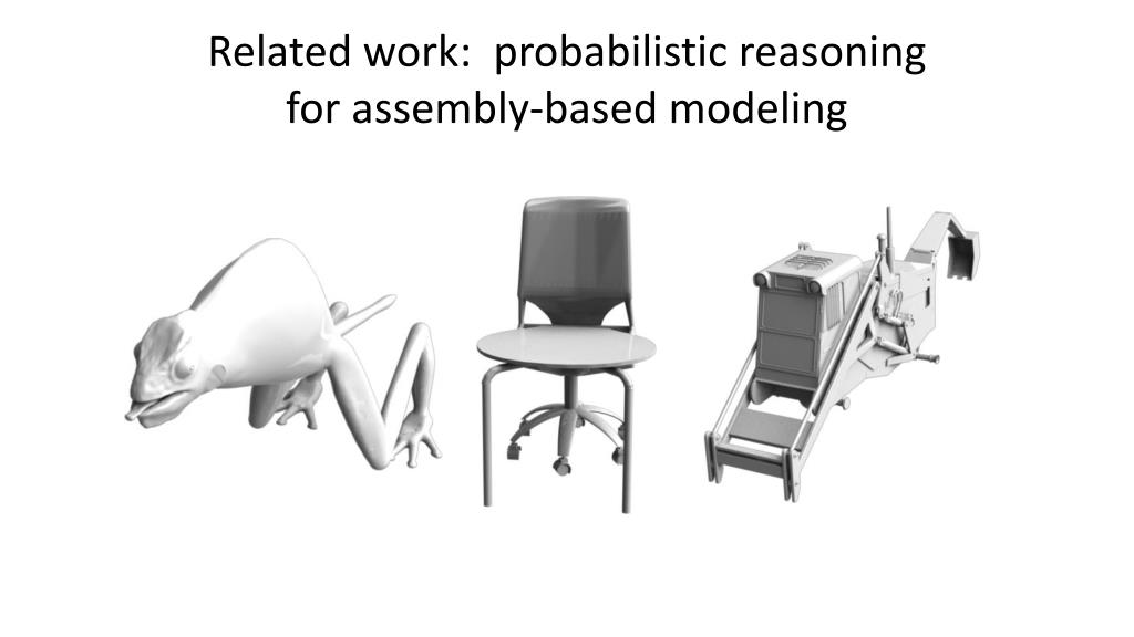 Related work: probabilistic reasoning for assembly-based modeling [Chaudhuri et al. 2011] Inference Modeling interface Probabilistic model
