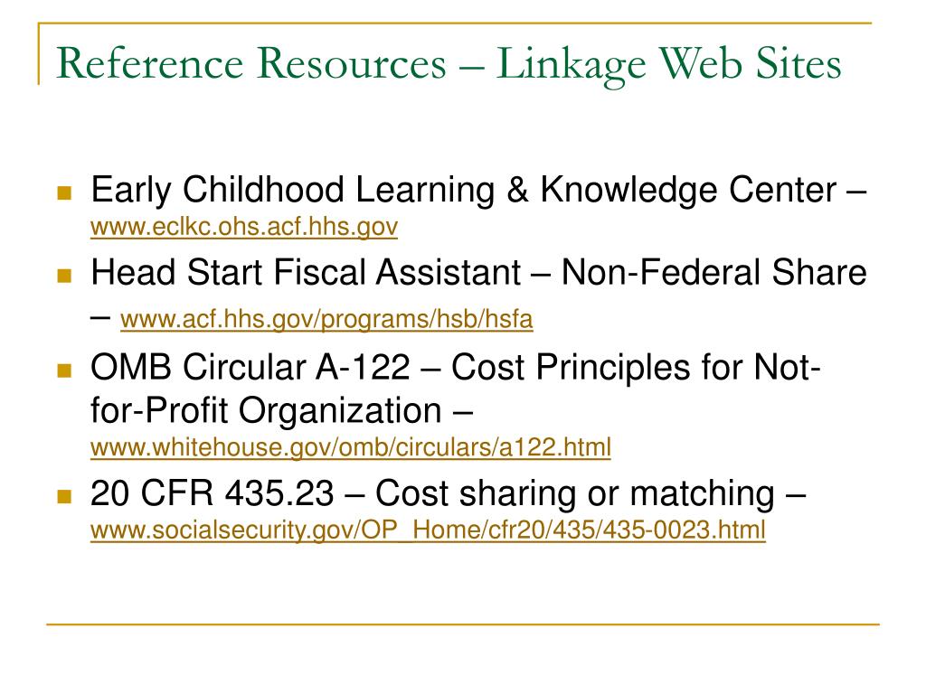 Reference Resources – Linkage Web Sites • Early Childhood Learning & Knowledge Center – www.eclkc.ohs.acf.hhs.gov • Head Start Fiscal Assistant – Non-Federal Share – www.acf.hhs.gov/programs/hsb/hsfa • OMB Circular A-122 – Cost Principles for Not-for-Profit Organization – www.whitehouse.gov/omb/circulars/a122.html • 20 CFR 435.23 – Cost sharing or matching – www.socialsecurity.gov/OP_Home/cfr20/435/435-0023.html
