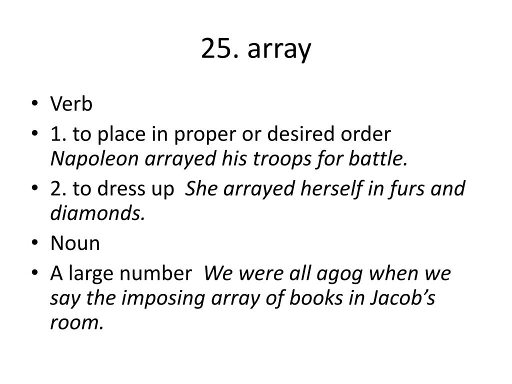 25. array • Verb • 1. to place in proper or desired order Napoleon arrayed his troops for battle. • 2. to dress up She arrayed herself in furs and diamonds. • Noun • A large number We were all agog when we say the imposing array of books in Jacob’s room.