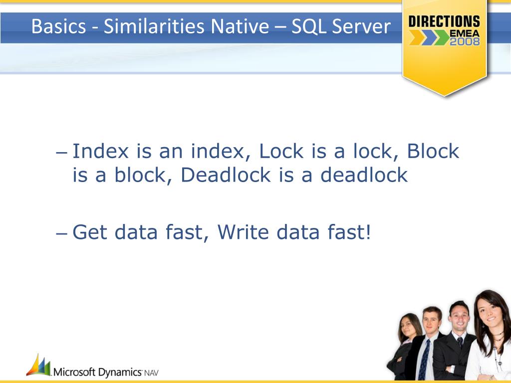 Basics - Similarities Native – SQL Server • Index is an index, Lock is a lock, Block is a block, Deadlock is a deadlock • Get data fast, Write data fast!